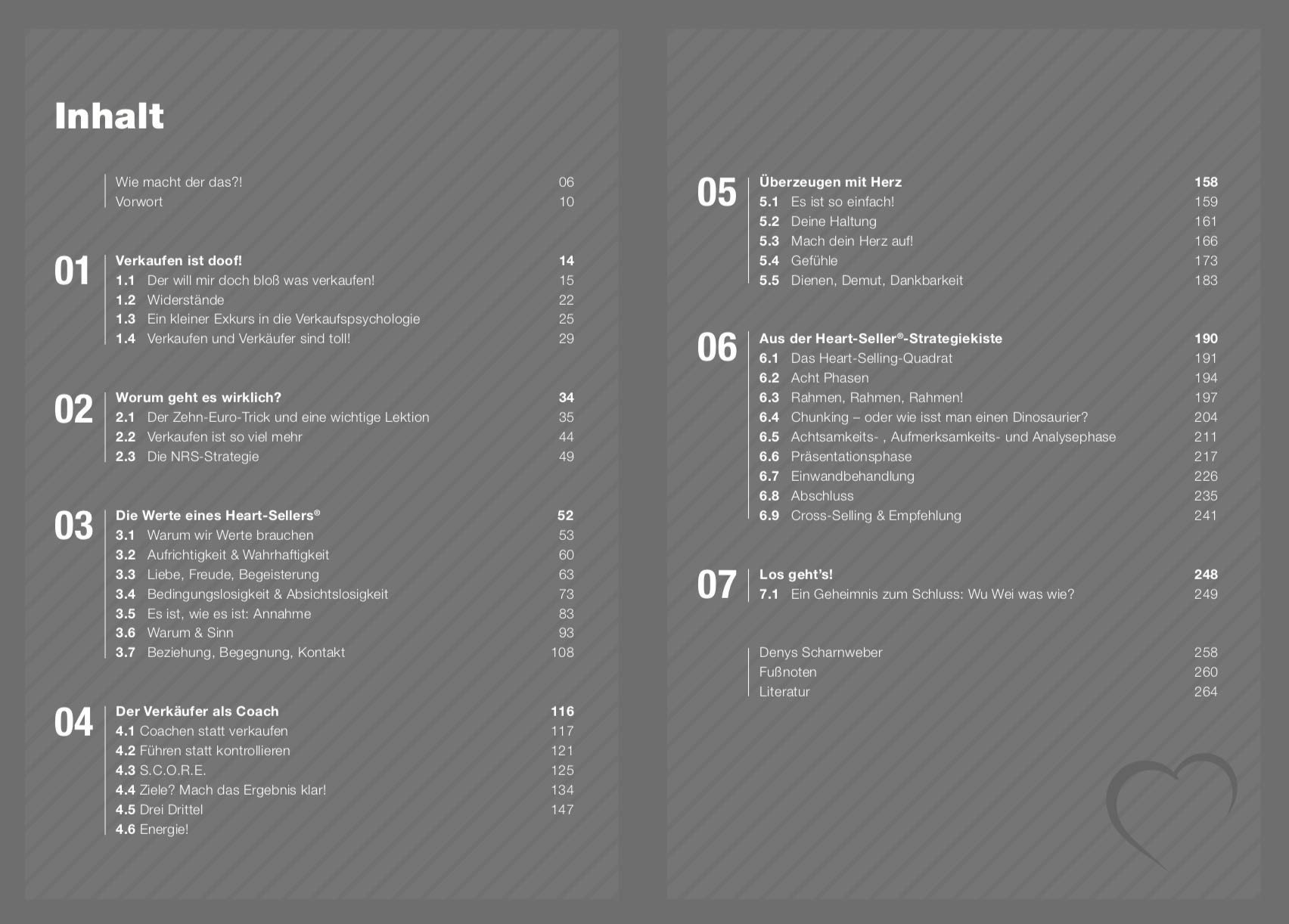 Richtig gute Verkäufer verkaufen nicht. Richtig gute Verkäufer dienen ihren Kunden. Dieser Ansatz verlangt ein völlig anderes Mindset – und vor allem: Ein offenes Herz. Die Heart-Seller-Philosophie dreht die bisherigen Regeln des Verkaufens komplett auf den Kopf. Denn wir beginnen nicht mit der Frage, wie kriege ich den Kunden möglichst schnell in einen Abschluss reingequatscht, sondern wir beginnen ganz woanders. Nämlich bei dir. Wer bist du? Wie tickst du? Was ist deine Haltung? Was sind deine Werte? Begegnest du der Welt offen, mit Freude und Leichtigkeit? Aber was verändert das? Es verändert den kompletten Verkaufsprozess. Du tust das mit Freude und Leichtigkeit. Deine Kunden genießen diese Begegnung mit dir. Deine Kunden werden dir ganz anders begegnen als du es bisher gewohnt bist. Und auch deine daraus resultierenden Ergebnisse werden dich überraschen. Denn was wollen Menschen eigentlich immer? Worum geht es wirklich? Es geht am Ende nie um Zahlen. Es geht immer nur um echte, wahrhafte Verbindungen. Von Mensch zu Mensch. Von Herz zu Herz. Denys Scharnweber vereint in seinem Heart-Seller Methoden aus der Persönlichkeitsentwicklung mit bewährten Verkaufsstrategien und packt den Einsatz von Herzenergie noch oben drauf. „Meine Vision ist, die Menschen ins Herz und ins Fühlen zu bringen, damit sie mit sich und mit anderen besser umgehen. Nur so kann die Welt besser werden. Das Buch, das du hier in den Händen hälst, ist so viel mehr als “nur ein Verkaufsbuch”. Es geht nämlich gar nicht ums Verkaufen. Es geht auch nicht um den Abschluss. Vielmehr wünsche ich mir, dass es zu deiner Fibel für deinen wahrhaftigen Erfolg wird, bei dem es zuerst um deine Wahrhaftigkeit geht, und erst im zweiten Schritt um deinen Erfolg. Auf diesem Weg dorthin möchte ich dich begleiten. Gehen wir gemeinsam los, mit Seele, mit Herz, mit Leidenschaft! Bist du dabei? Kommst du mit?“ – Denys Scharnweber