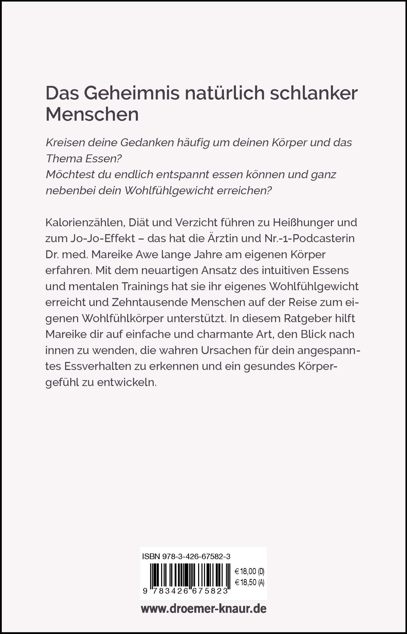 Dr. Mareike Awe kennt all dies nur zu gut aus ihrer eigenen Vergangenheit. In ihrem Buch unterstützt sie dich deshalb dabei, deinem Körper wieder zu vertrauen und somit unbeschwert und langfristig zu deiner Wohlfühlfigur zu finden.